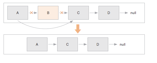 B를 제거한다고 할 때 A의 다음 요소를 C로 변경하기만 하면 A -> C -> D 순서가 된다.