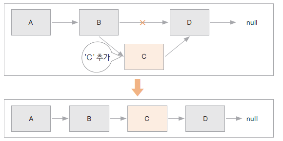 배열이라면 D 요소를 뒤로 밀고 공간을 비워서 그 자리에 C를 놓는다.